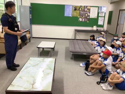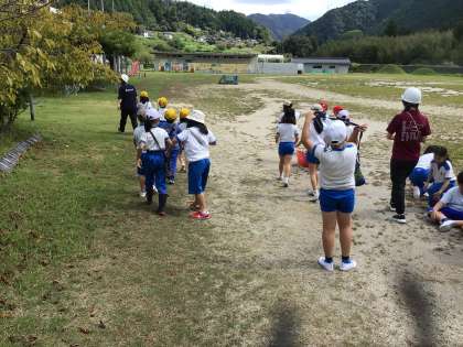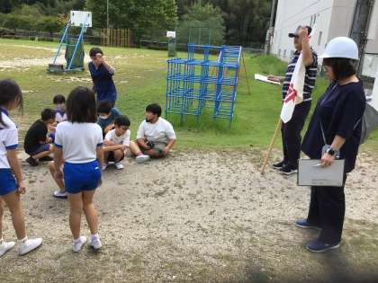 地震に対する避難訓練を行いました。想定として大規模な地震があり、ダムの決壊の恐れがあるとして、学校を離れて、旭支所の交流館まで避難を行いました。「おさない、走らない、しゃべらない、もどらない」の「おはしも」を意識して、迅速に行動することができました。消防署の方には25年前の東海豪雨の話もしていただき、改めて自分の身を守ることの大切さを考えることができました。