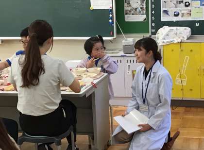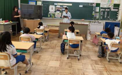 旭中学校の栄養教諭の先生を講師にお招きして、1・2年生で給食学習会を行いました。給食ができるまで、どんな方がかかわってくださっているのかを学んだり、調理器具を見てみたりしながら、多くの人の協力で給食ができていることを学ぶことができました。これから給食の時間に頑張りたいことを振り返ると「たくさんの人に感謝して食べたい」「残さずしっかりと食べたい」という意見を聞くことができました。1年生の保護者の方にも参加していただきながら、給食試食会も実施し、児童が普段食べている様子なども知っていただくことができました。