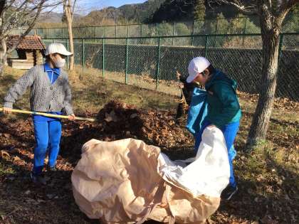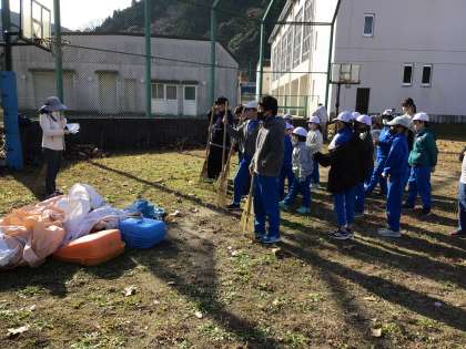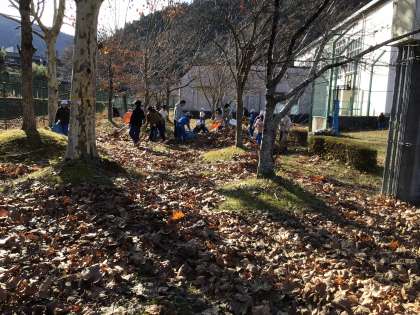 掃除の時間に、全校で落ち葉集めを行いました。大きな葉っぱや小さな葉っぱ、フカフカになるまでたくさんたくさん集めました。集めた落ち葉は、腐葉土にしながら、また利用していきたいと思っています。