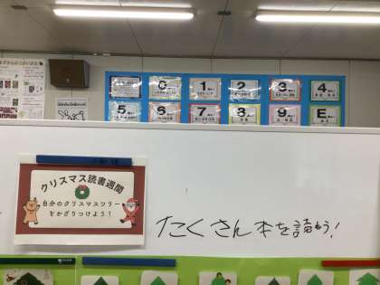 図書委員会の企画で、クリスマス読書週間を実施しています。期間中に読書した本の冊数だけ、自分のクリスマスツリーのカードにシールを貼ってデコレーションする事ができます。ぜひ、たくさんの本が読めると良いなと思います。