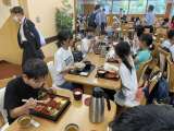 京都の宿で一泊した六年生は、身支度をして朝食を食べました。食事中も朝から元気な様...