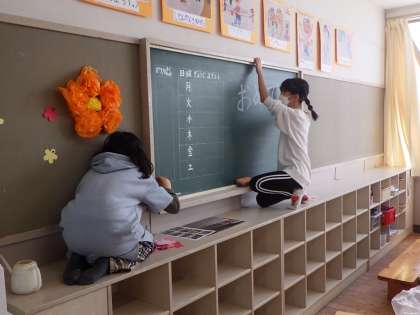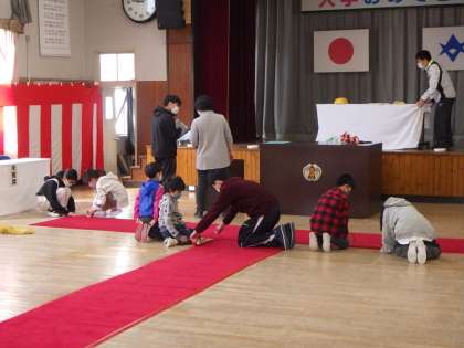 5日に4年生以上の児童が出校して、入学式の会場準備を手伝ってくれました。いすを並べる子、赤いじゅうたんのほこりを取る子、教室に飾りつけをする子など、どの子も一生懸命準備をしました。1年生を迎えるみんなの心がきっと1年生に届いていますよ。