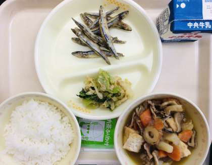 本日の給食は『ごはん、牛乳、きびなごのから揚げ、チンゲンサイとツナのあえもの、生揚げと新じゃがのうま煮、抹茶ふりかけ』です。とても美味しかったです。ごちそうさまでした!