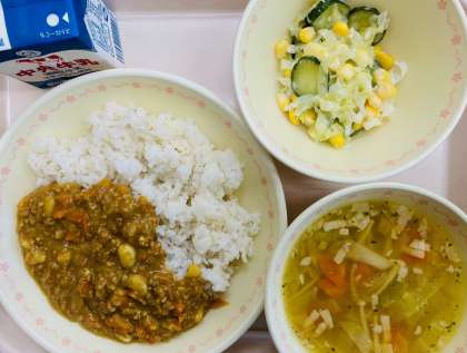 本日の給食は『麦ごはん、牛乳、お豆のドライカレー、コールスローサラダ、野菜たっぷりスープ』です。とても美味しかったです。ごちそうさまでした!