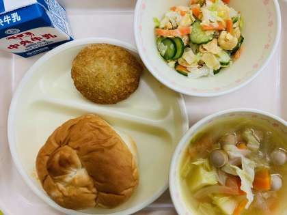 今週は歯と口の健康週間です。本日の給食は『りんごパン、牛乳、キャベツ入りメンチカツ、ナッツサラダ、ポトフ』です。とても美味しかったです。ごちそうさまでした!