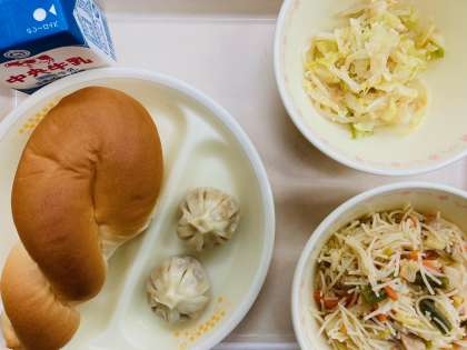 本日の給食は『ツイストパン、牛乳、ショウロンポウ、華風あえ、炒めビーフン』です。とても美味しかったです。ごちそうさまでした!