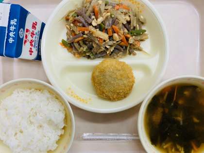 本日の給食は『ごはん、牛乳、れんこんサンドフライ、五目きんぴら、すまし汁』です。とても美味しかったです。ごちそうさまでした!