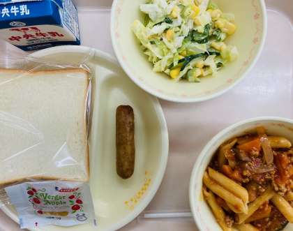 本日の給食は『スライスパン、牛乳、ウインナー、コーンサラダ、なすとペンネのトマト煮、りんごジャム』です。とても美味しかったです。ごちそうさまでした!