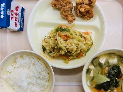 本日の給食は『ごはん、牛乳、とり肉の唐揚げ、ごまあえ、白みそ汁』です。とても美味しかったです。ごちそうさまでした!