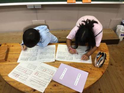 今日からトーンチャイム練習が始まりました。まずは、役割分担です。自分が担当する音をチェックしています。