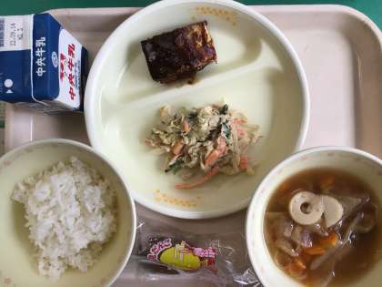 本日の献立は『白ごはん、のっぺい汁、さばのみそ煮、野菜のねりごまあえ、牛乳、月見だんご』でした。おいしくいただきました。