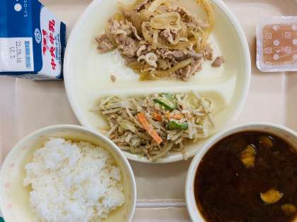 本日の給食は、豊田ブランドの日です。『ごはん、牛乳、ひまわりポークのしょうが炒め、ごぼうサラダ、なすのみそ汁、ももゼリー』です。とても美味しかったです。ごちそうさまでした!