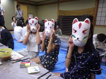 奈良公園を後にして京都へ向かい、旅館に入りました。夕食後、旅館できつね面の絵付け体験をしました。真っ白なきつねの面に顔料を使って模様を描いていきます。子どもたちそれぞれに気に入った色の顔料で模様をつけていきました。完成した面をつけて記念写真を撮りました。