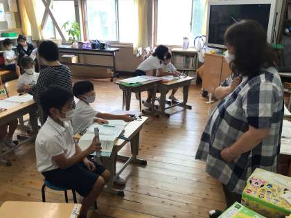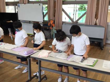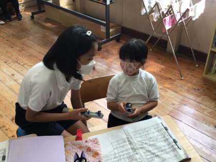 1年生もトーンチャイムを持って、練習をしています。上級生がていねいに教えています。