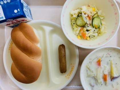 本日の給食は、『ツイストパン、牛乳、あらびきウインナー、フレンチサラダ、さつまいものクリーム煮』です。とても美味しかったです。ごちそうさまでした!