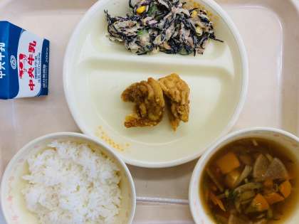 本日の給食は、『ごはん、牛乳、とり肉のカレー揚げ、骨太サラダ、けんちん汁』です。とても美味しかったです。ごちそうさまでした!