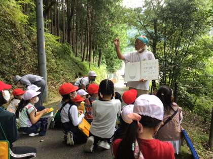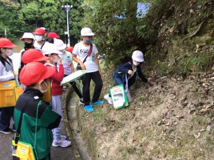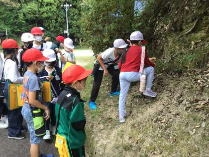 始めの会後は、3つのグループに分かれて、それぞれが活動をすることになっています。写真は、自然観察会の様子です。