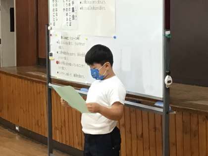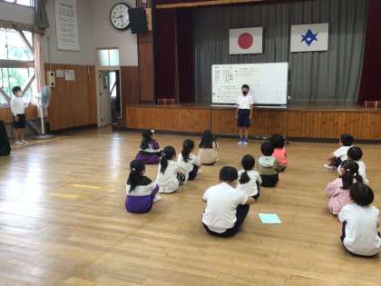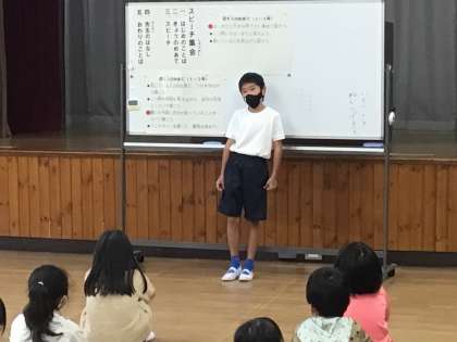 1〜3年生のスピーチが集会室で行われました。一輪車の話や誕生日会の話がスピーチの話題となっていました。
