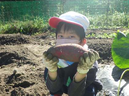 20日(木)に1・2年生がサツマイモ掘りに出かけました。畑の先生である深見聖二さんの畑で掘らせていただきました。子どもたちが静かに土を掘っていくと、大きなサツマイモが顔をのぞかせます。子どもたちは夢中で土を掘りました。次から次へと出てくるサツマイモに大喜びでした。学校の畑で作ったサツマイモも大きくなっているといいですね。