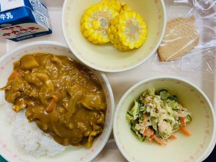 本日の給食は祝ジブリパーク開園献立です。『カレーライス、牛乳、チキンサラダ、とうもころし、どんぐり型クッキー』です。とても美味しかったです。ごちそうさまでした!