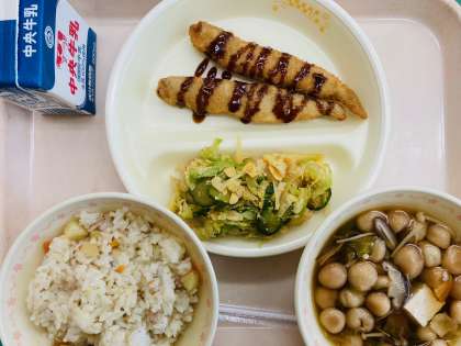 今週の給食は日本型食生活週間です。本日の給食は、『もみじごはん、牛乳、ししゃもフライ、アーモンドあえ、ふだま汁』です。とても美味しかったです。ごちそうさまでした!