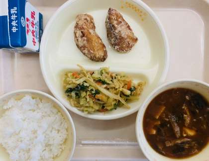 今週の給食は日本型食生活週間です。本日の給食は、『ごはん、牛乳、さばの竜田揚げ、ごまあえ、みそ汁』です。とても美味しかったです。ごちそうさまでした!