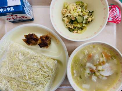 本日の給食は、『中華めん、牛乳、とんこつラーメン、揚げしゅうまい、華風あえ、プチゼリー(アセロラ)』です。とても美味しかったです。ごちそうさまでした!