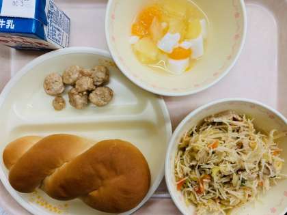 本日の給食は、『ツイストパン、牛乳、肉だんごのあんからめ、豆乳杏仁豆腐、炒めビーフン』です。とても美味しかったです。ごちそうさまでした!