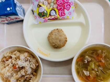 本日の給食はひなまつり献立です。『ちらしずし、牛乳、豆腐ハンバーグ、すまし汁、ひなあられ』です。とても美味しかったです。ごちそうさまでした!