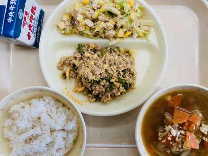 本日の給食は、『麦ごはん、牛乳、そぼろ丼、大豆サラダ、かみなり汁』です。とても美味しかったです。ごちそうさまでした!