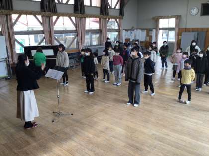 本日は、講師をお招きして、卒業式へ向けての歌の練習を行いました。卒業生と在校生一緒に歌う『旅立ちの日に』を中心に指導していただきました。本番では、気持ちを込めて歌えるように、これからも練習をしていきます。
