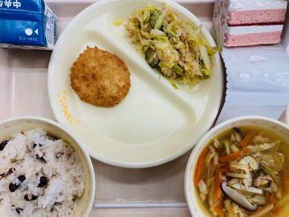 本日の給食は卒業祝い献立です。『赤飯、牛乳、えびカツ、和風サラダ、沢煮わん、米粉のケーキ(いちご豆乳クリーム)』です。とても美味しかったです。ごちそうさまでした!