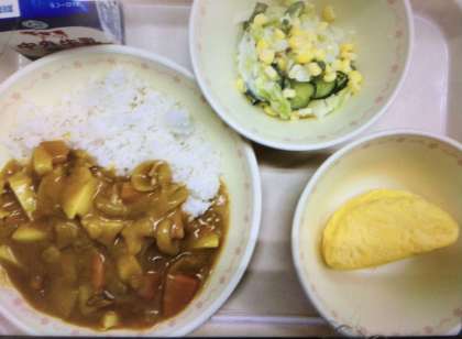 本日の給食は、『麦ごはん、牛乳、カレーライス、オムレツ、コールスローサラダ』です。とても美味しかったです。ごちそうさまでした!