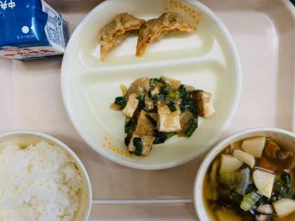本日の給食は、『ごはん、牛乳、揚げ餃子、生揚げのオイスターソース炒め、中華スープ』です。とても美味しかったです。ごちそうさまでした!