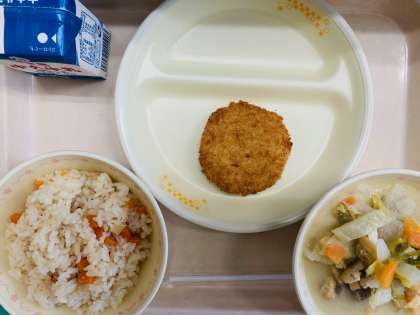 本日の給食は、『たけのこごはん、牛乳、コロッケ、豆乳のバランスみそ汁』です。とても美味しかったです。ごちそうさまでした!