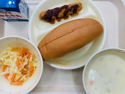 本日の給食は、『サンドイッチロール、牛乳、とんかつドッグ、キャベツソテー、マカロニのクリームスープ』です。とても美味しかったです。ごちそうさまでした!