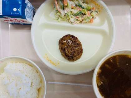 本日の給食は、『ごはん、牛乳、照り焼きハンバーグ、ツナマヨあえ、豚汁』です。とても美味しかったです。ごちそうさまでした!