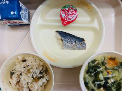 本日の給食は、『山菜まぜごはん、牛乳、さわらの塩焼き、生揚げの白みそ汁、プチゼリー(アセロラ)』です。とても美味しかったです。ごちそうさまでした!