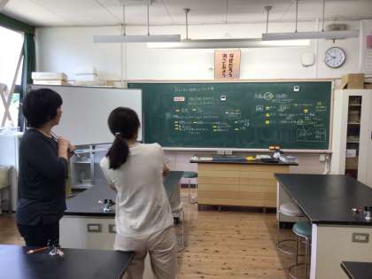 授業が終わった後の理科室で、先生たちが話し合っています。 先生たちも良い授業にするために常に勉強しています。