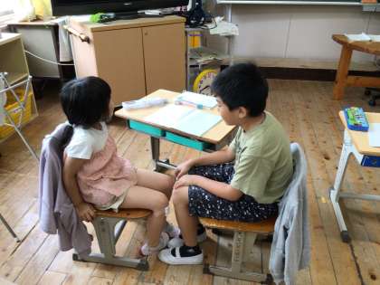 2年生 国語 メモをつかって 公開日 2023/05/23 更新日 2023/05/23 各学年から 2年生は国語で聞くことの学習に入りました。 はじめ、担任の先生が、ドラえもんになりきって自己紹介をしました。 それを一生懸命ノートに記録しようとしますがほとんどできません。 それでは、どうしたらいいのかな、と相談が始まりました。