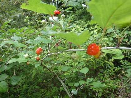 ササユリのつぼみは、だいぶ大きくなっていて、山頂で咲いていた白いかわいい花は赤いおいしそうなイチゴになっていました。