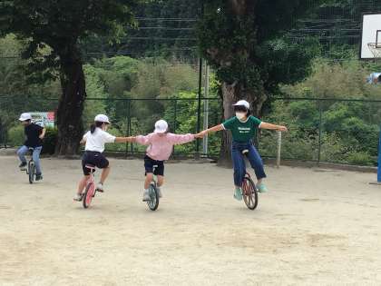 校庭で、大きい子も小さい子も一緒になってあそんでいます。