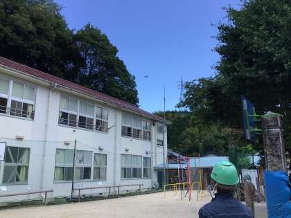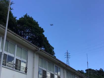 今日は、「とい」の調査がありました。追分小学校の屋根についているといはとても高い位置にあるのですが、校庭への入り口が狭いため、高所作業車も入れそうにありません。どうやって調査するのだろうと思っていたら、ドローンを飛ばして写真撮影をしていました。