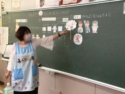 自分と友達の体を大切にすること、それは、たとえばどうすることなのか、養護教諭が低学年の子にもわかりやすく伝えています。