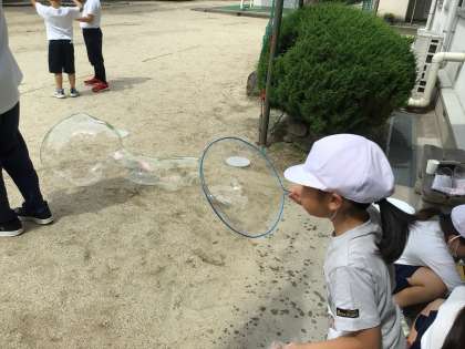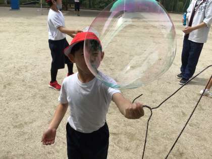 ハンガー、ラップの芯、虫取り網に段ボール。色々な道具でシャボン玉を作ろうと、準備をしてきた子どもたち。楽しそうにシャボン玉を作っていました。