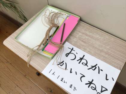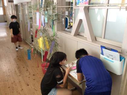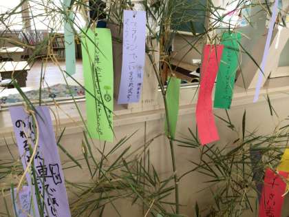 1階廊下の七夕飾りです。「たくさん泳げるようになりますように」「ずっと友達といっしょにいられますように」など。お願い事が叶うといいですね。