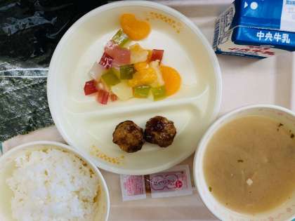 本日の給食は防災の日献立です。『ごはん、牛乳、ごまつくね、フルーツポンチ、みそ汁(備蓄用)、梅びしお、おにぎりのり』です。とても美味しかったです。ごちそうさまでした!
