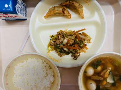 9月6日給食 公開日 2023/09/06 更新日 2023/09/06 お知らせ 本日の給食は、『ごはん、牛乳、揚げぎょうざ、ホイコーロー、うずら卵と野菜のスープ』です。とても美味しかったです。ごちそうさまでした!