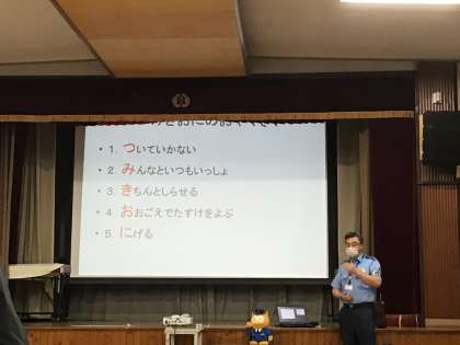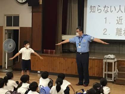 子どもたちは、防犯教室で、合言葉「つみきおに」の確認や腕を掴まれた時の振り解き方などを教えていただきました。