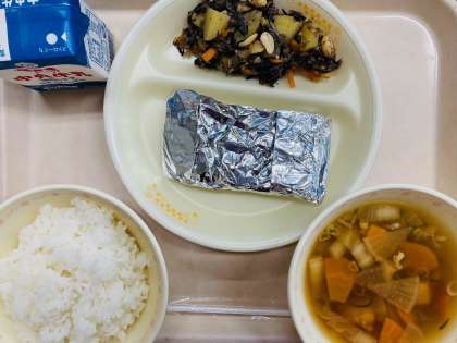 本日の給食は、『ごはん、牛乳、さばの銀紙焼き、ひじきの炒め煮、かしわ汁』です。とても美味しかったです。ごちそうさまでした!